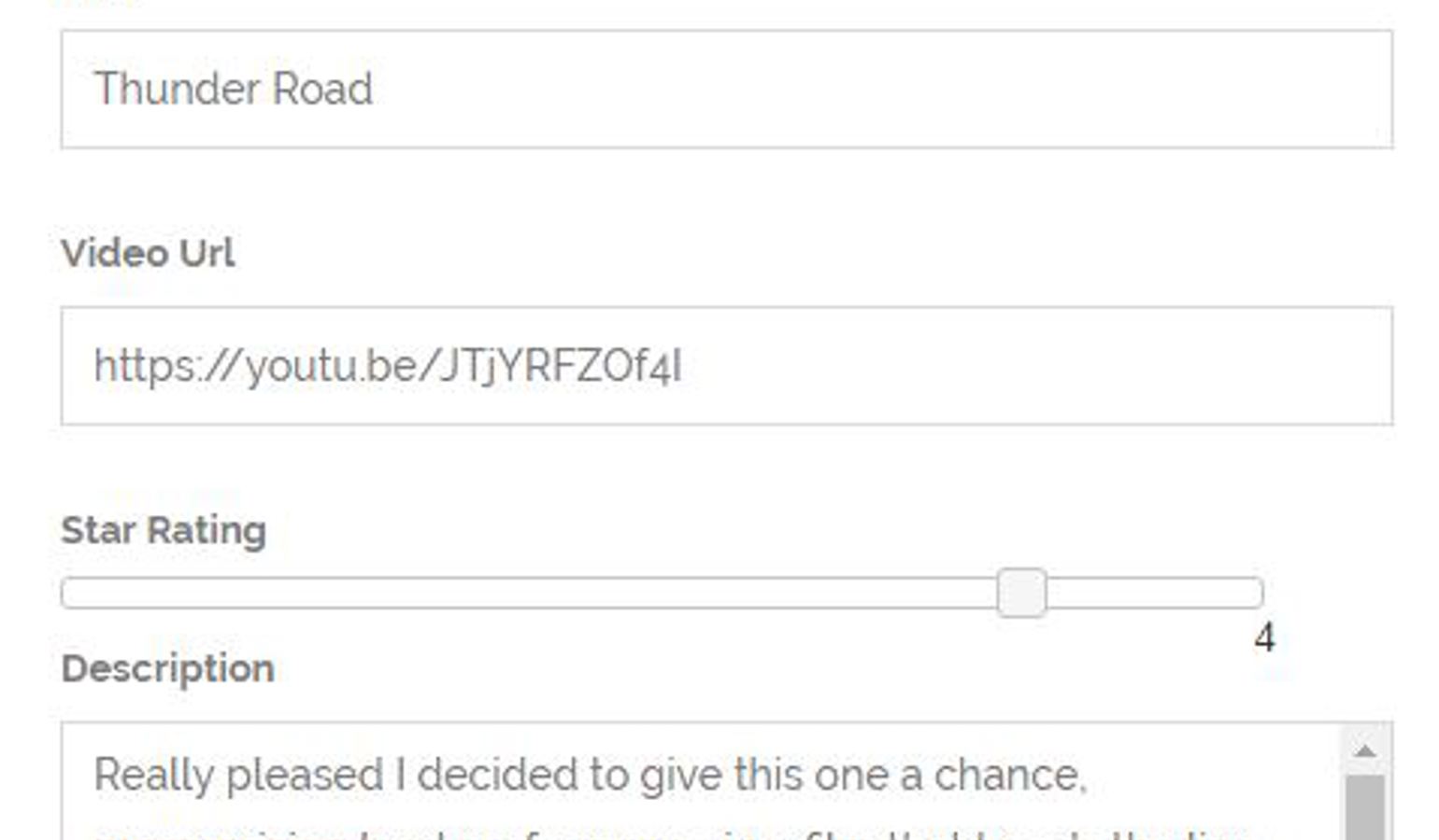 For the slider (for the star rating) and date picker I used the JQuery UI library. These required a bit of extra JavaScript to initialise the controls and to store the values in the correct fields when they change.