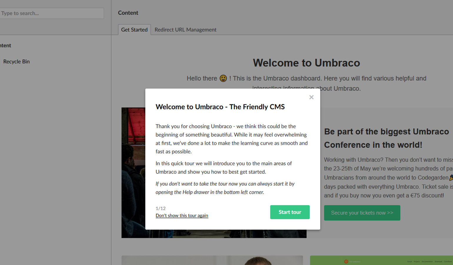 Click on “Continue” and agree to configure the ASP.NET Machine Key and choose not to install the starter site (unless, of course, you want to). After a few minutes of Umbraco knowledge gems, you will see the Umbraco back-office and the CMS has been successfully installed.